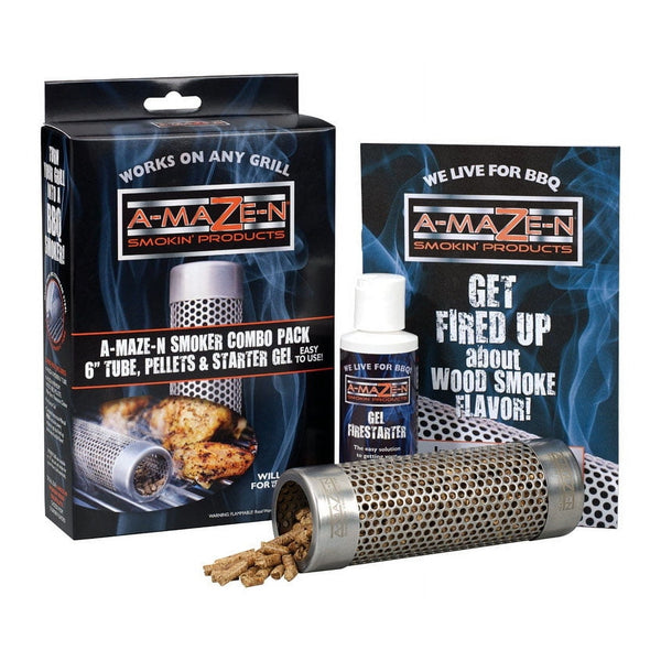 The A-MAZE-N Combo pack includes a 6" tube, pellets, and a starter gel. Turn any grill into a BBQ smoker. The 6" tube smoker will burn up to 2 hours, depending on the smoker temps, type of pellets and draft inside your smoker. The smoker tube was designed to produce more smoke than usual without overcooking, it will produce smoke at cooking temps. It is constructed of stainless steel, it's durable and will not rust. It can be used in a smoker or grill. The gel firestarter is the easy solution to getting your wood BBQ pellets smokin'. The gel won't flavor your food. The combo pack includes a booklet with instructions and recipes to help you get started.