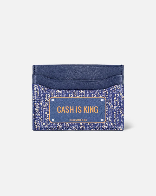With four card slots and a central pocket, it keeps your credit cards, loyalty cards, and business cards neatly organized without adding bulk. The monochrome John Hatter logo and bold "CASH IS KING" statement gives it an unmistakable edge.