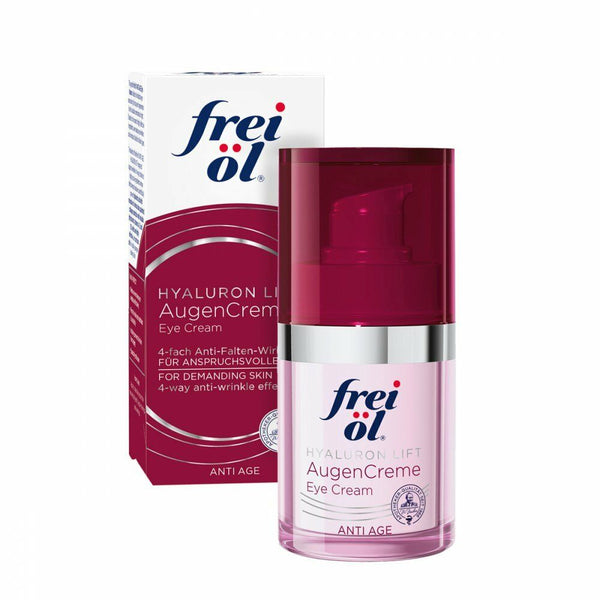 frei öl® Anti-aging Hyaluron Lift Eye Cream can be applied around the eyes with reduced hyaluronic acid with associated wrinkling and loss of elasticity. Tension reductions are offset by frei Oel Anti-age Hyaluronic Lift Eye Cream and your eyes regain their luminosity.