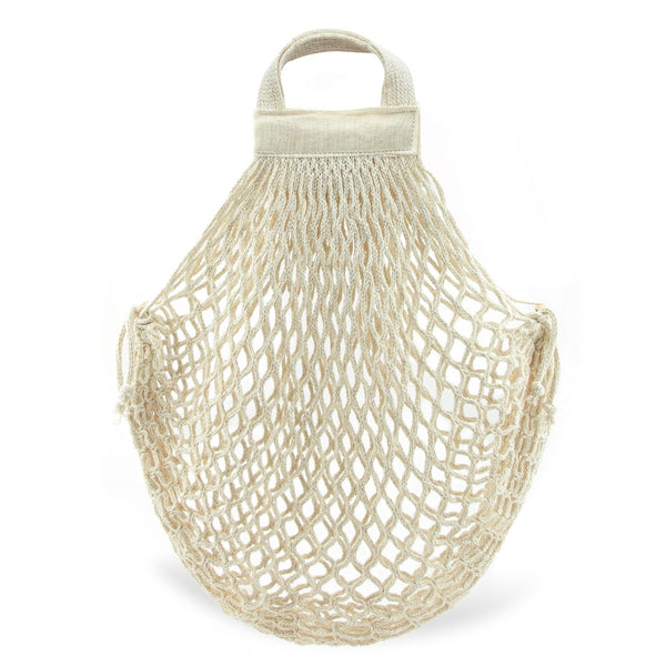 A compact reusable market bag made from 100% knitted, mesh cotton that greatly expands to tote bundles of fruit, vegetables and other groceries home from the market. These super sturdy bags will fold neatly into a purse or backpack and stretch to hold up to approximately 40 lbs. of goods. These Market Bags have been used for generations and have stood the test of time due to their reliability.